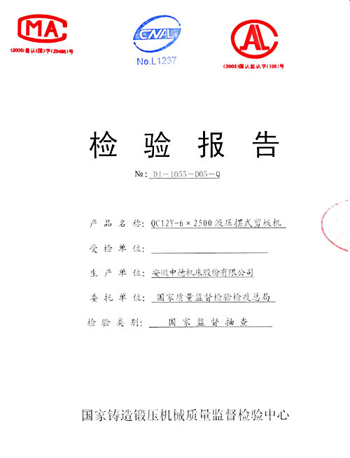 根據(jù)2006年第4季度剪板機(jī)國家監(jiān)督抽查實(shí)施方案,受國家質(zhì)量監(jiān)督檢驗(yàn)檢疫總局委托,國家鑄造鍛壓機(jī)械質(zhì)量監(jiān)督檢驗(yàn)中心,于2006年9月23日,對本公司產(chǎn)中德牌液壓擺式剪板機(jī)進(jìn)行了現(xiàn)場檢驗(yàn)。近日,我公司收到了本次抽檢的結(jié)果通知單及檢驗(yàn)報(bào)告,結(jié)果為:合格。